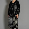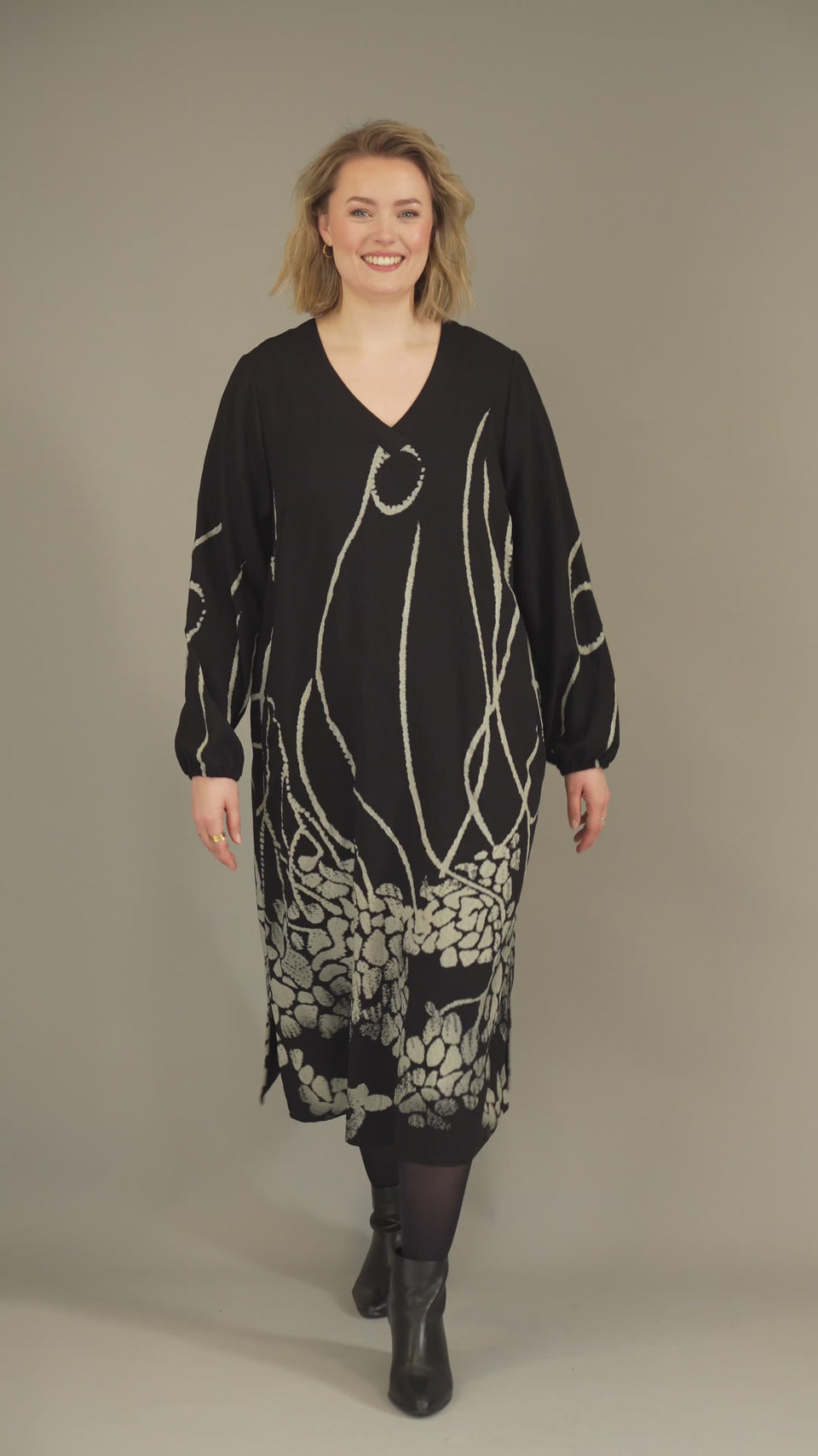 En elegant og stilfuld kjole fra Gozzip i sort med et smukt grafisk print i grå nuancer. Kjolen har V-udskæring, lange ærmer med elastikafslutning og en løs, behagelig pasform, der falder flot på kroppen. Den midi-lange længde gør den perfekt både til hverdag og festlige lejligheder.