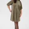 Designet har en høj rund hals, halvlange ærmer med let pufdetalje og en afslappet A-formet pasform, som gør kjolen både flatterende og komfortabel. Den knælange længde gør den anvendelig til både hverdag og festlige anledninger.