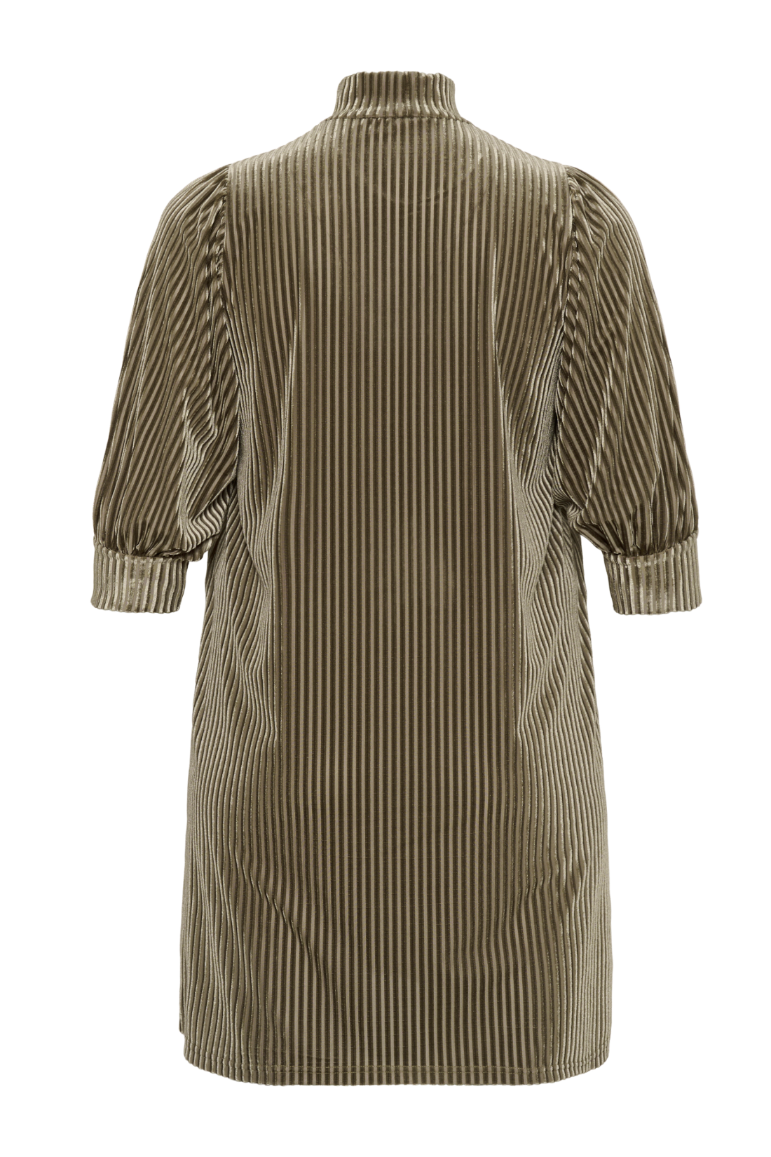 Elegant kjole i blød og luksuriøs velour, der giver et sofistikeret look og en behagelig følelse mod huden. Kjolen er med lodrette striber, som skaber et slankt og stilfuldt udtryk.