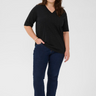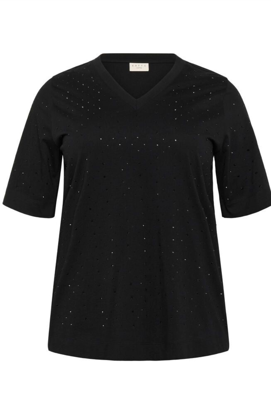 Elegant og behagelig sort T-shirt med fine, diskrete sten, der giver et strejf af glans til hverdagslooket. T-shirten har en flatterende V-udskæring og korte ærmer, der gør den perfekt til både jeans og nederdele.