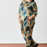 Blusen har klassisk rund halsudskæring og 3/4 ærmer der afsluttes med elegante bindebånd bagpå.