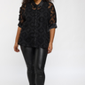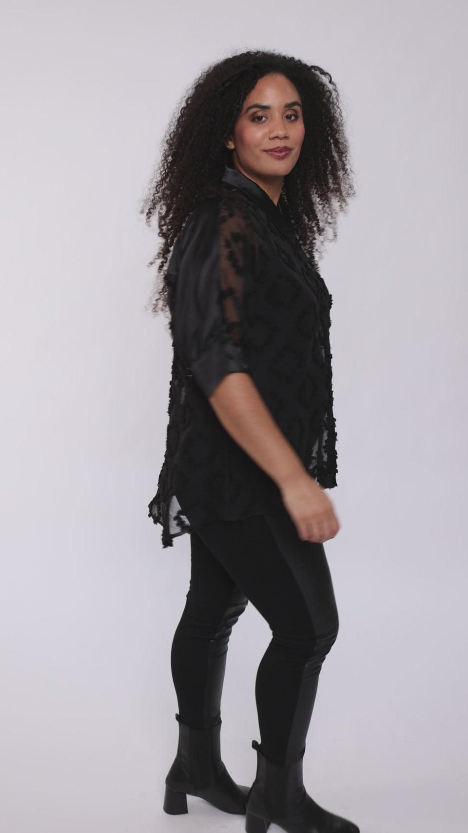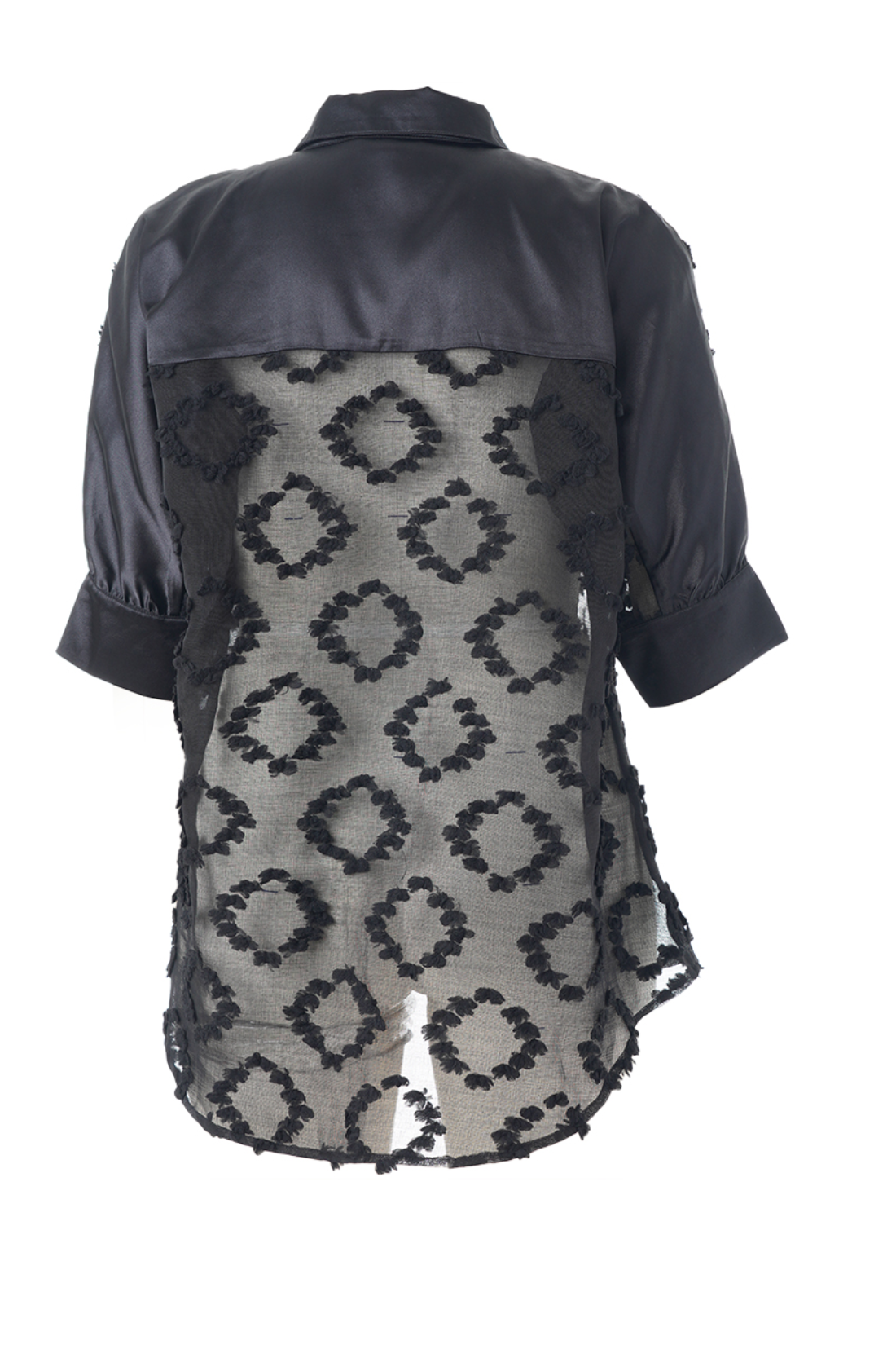 En unik og stilfuld skjorte i transparent stof med smukke, vævede mønstre. Skjorten har en klassisk skjortekrave i satinlook og 3/4-ærmer med manchet, der giver et eksklusivt touch. Den gennemknappede front gør den let at style både åben og lukket.