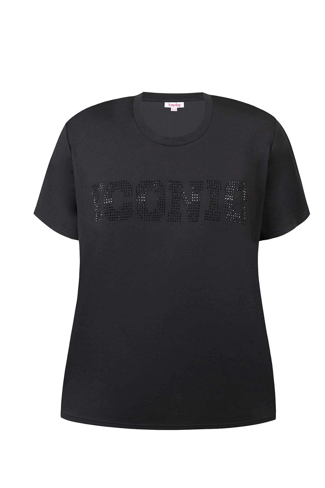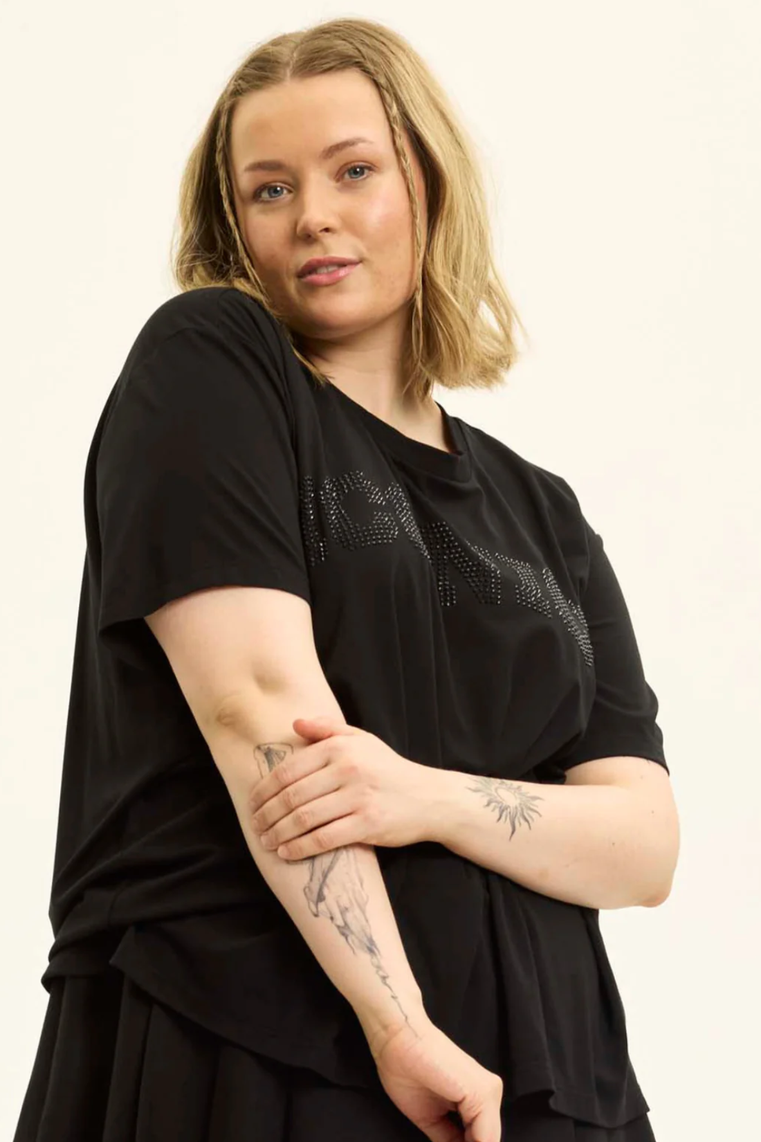 Dahlia 333 er en klassisk sort T-shirt med et moderne tvist. Den bløde og behagelige kvalitet kombineres med et diskret, men iøjnefaldende udtryk: en glitterende rhinestone-tekst foran, der tilføjer lidt ekstra kant til dit hverdagslook. Pasformen er løs – nem at style til både afslappede og festlige anledninger.