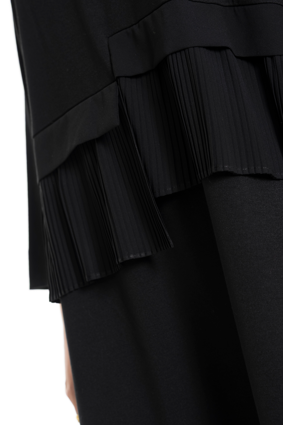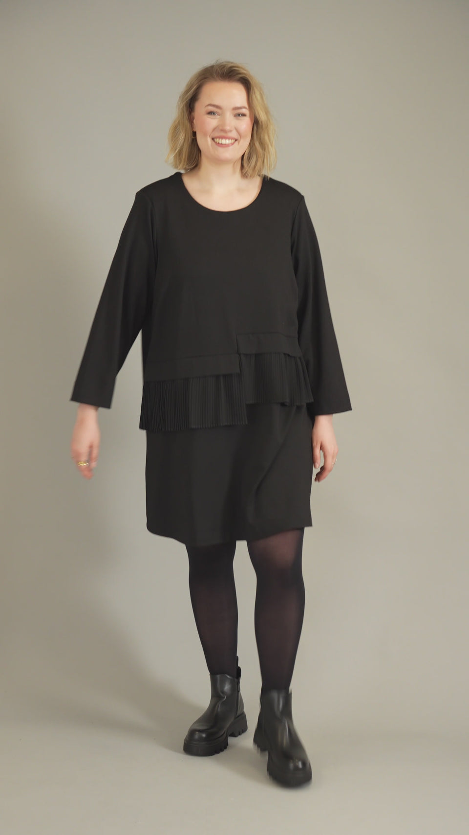 En enkel og stilfuld kjole fra Gozzip i sort, designet med feminine plissé-detaljer foran, som giver et moderne og elegant twist. Kjolen har rund hals, lange ærmer og en løs, behagelig pasform, der gør den perfekt til både hverdagsbrug og mere festlige lejligheder.