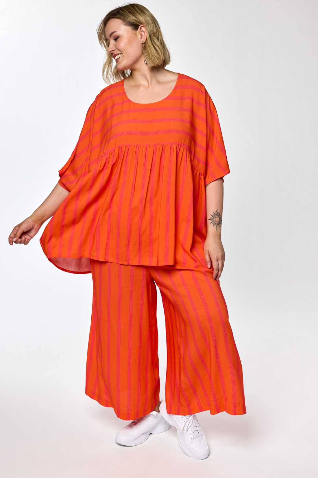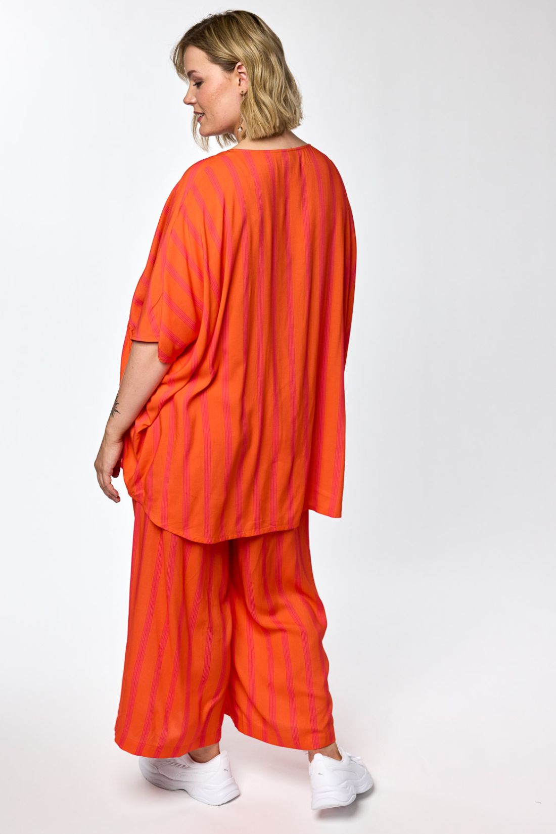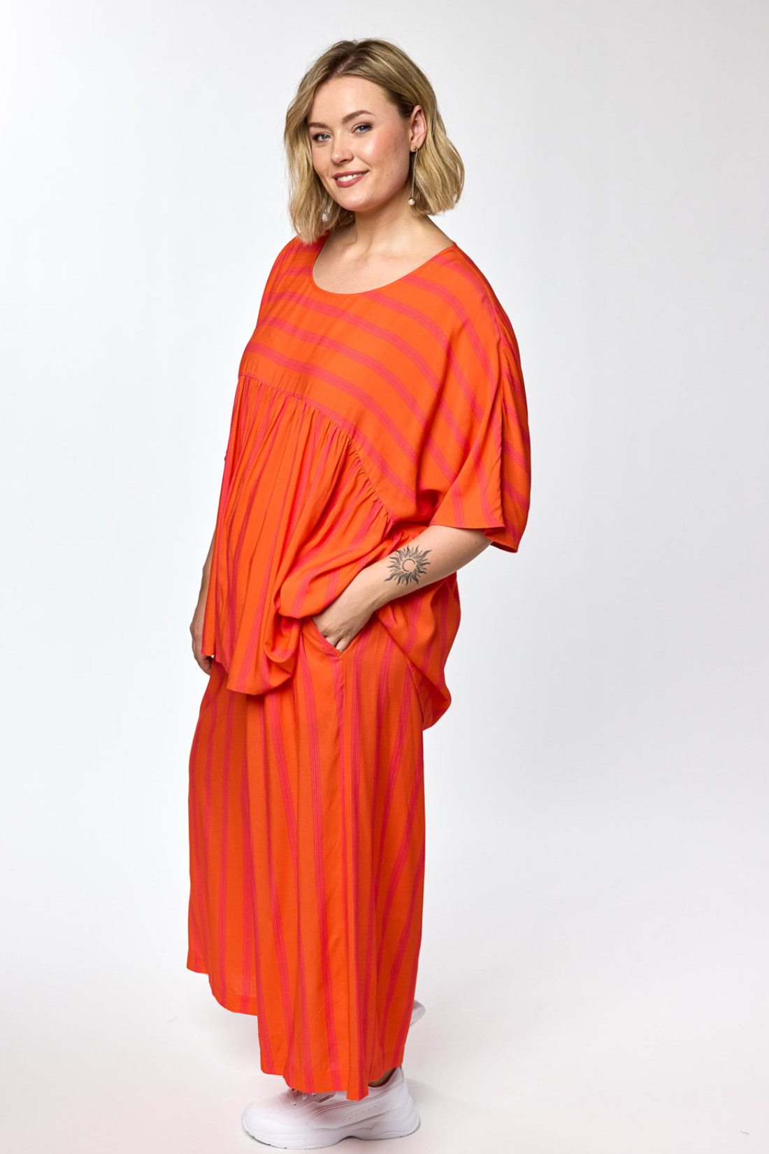 Denne smukke tunika fra Gozzip er designet i en varm orange farve med fine, diskrete striber, der giver et moderne og livligt udtryk. Tunikaen har et løst og rummeligt snit, som sikrer høj komfort og et flot fald.