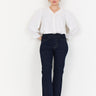 WA-SUMMER 5 er cool bukser fremstillet af 69 % bomuld, 28 % polyester og 3 % elastan. Disse elegante bukser har en midterhøj talje, en klassisk knaplukning og let flossede kanter for ekstra tekstur. Sæt dem sammen med en elegant bluse eller en afslappet T-shirt for et stilfuldt look.